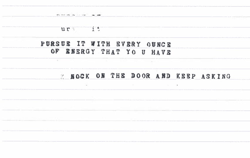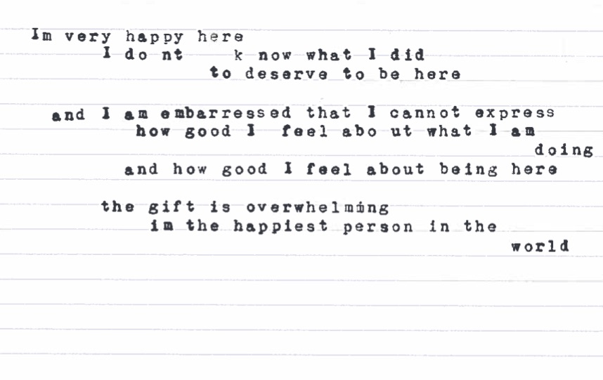 The decision to hand type allowed me to adapt the writing to a form (index cards) that could be transported to the site and importantly, be something that is non-linear, that could potentially be mapped or distributed differently than word processed content is. With typed or hand cut content, there was the possibility of multiple configurations. It has a different texture and became adaptable to being for instance, script cards selected by the subjects reading them in the filmed interviews.