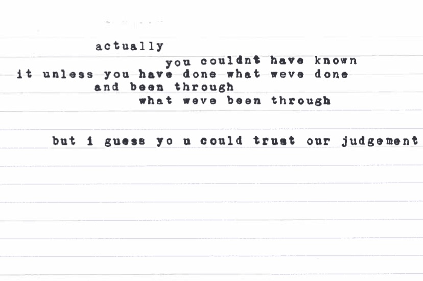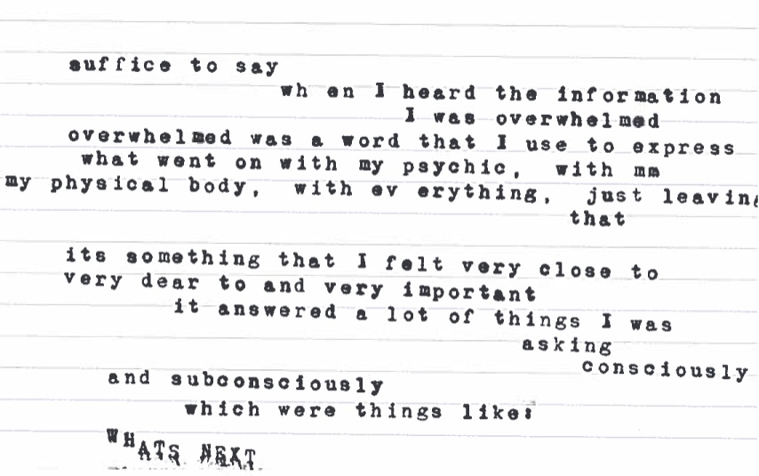 The decision to write by typewriter (a child’s typewriter from a discontinued 1970’s model that I had to hand spool the ribbons onto) was a response to the sheer volume of writing that I typed on computer whilst editing and re-editing what I thought was going to be a ‘traditional’ format document. There was no trace of the hand in this digital production, everything could be erased, cut, pasted – I wanted to signify that some of the things that I had written (at the beginning this was the fictional components) were distinct from that and had more value to me. The typing of them was an act of commitment to what was being expressed. The typewriter signalled a return to showing the trace of the hand in writing.